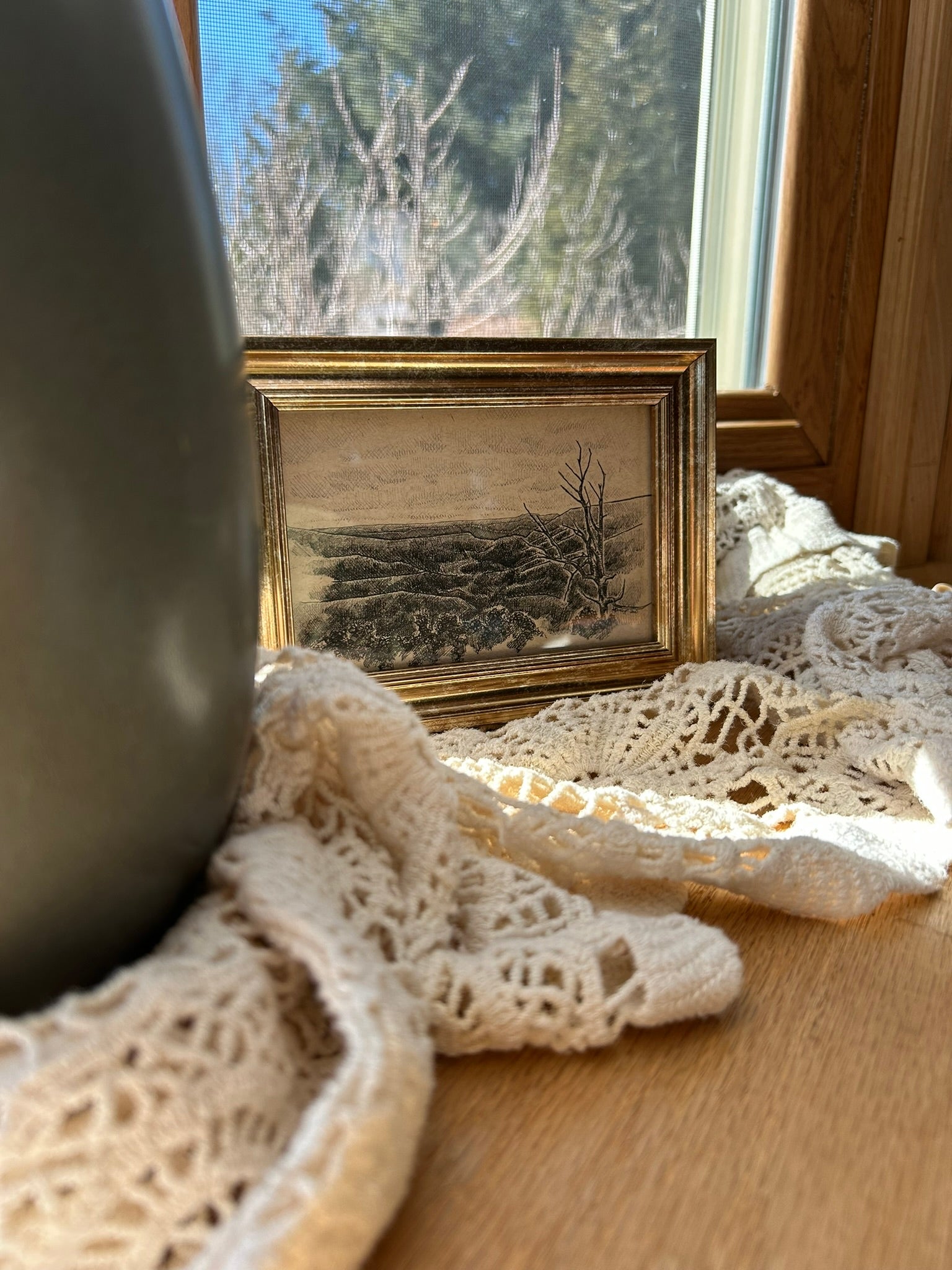 4x6" framed, original pen drawing on toned tan drawing paper.