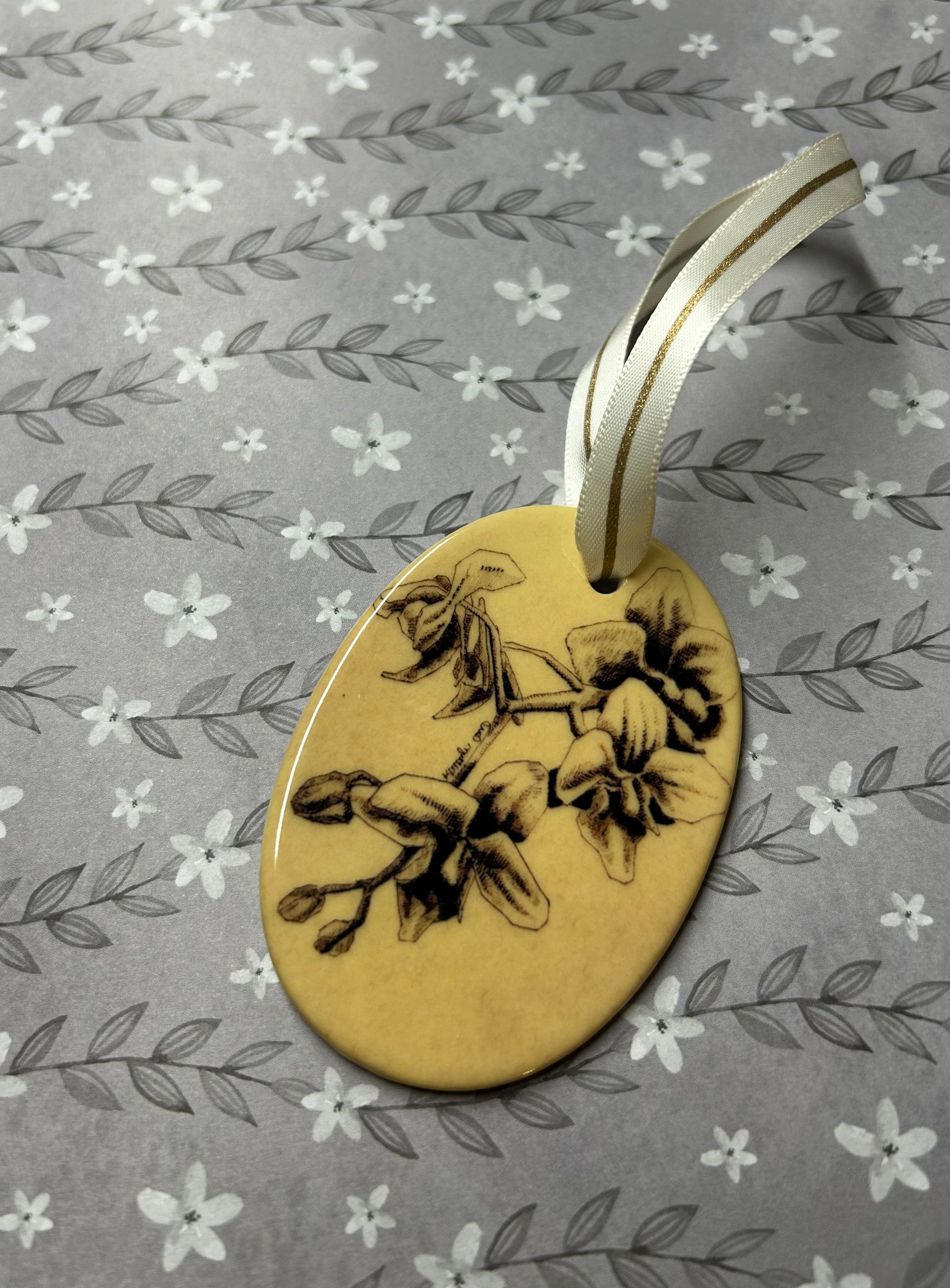 This ornament features one of my orchid flower pen drawings, and is about 3" tall, by 2" wide. Ribbon color may vary.