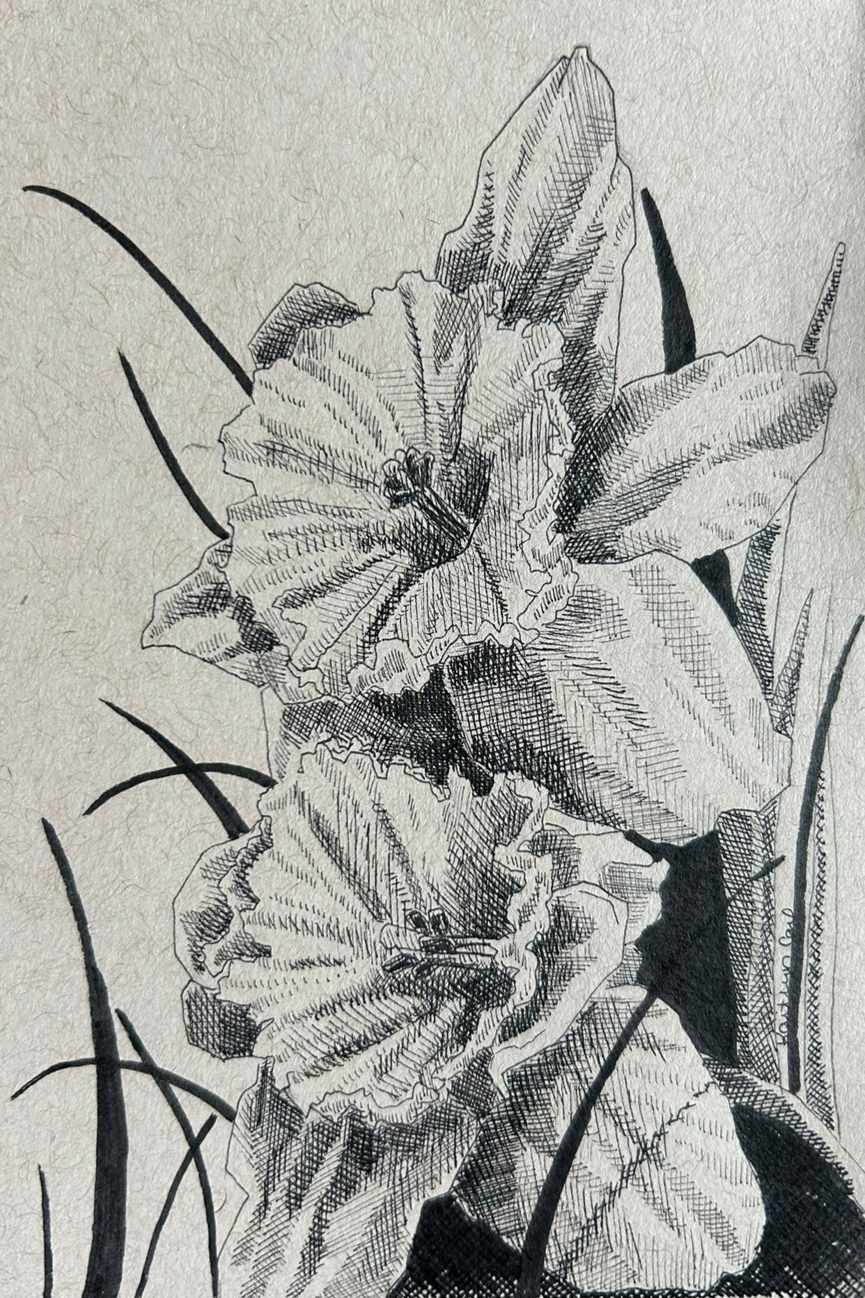 A 4x6" original drawing on tan, 80lb. paper. Drawing ships ready to display in a cute little frame.