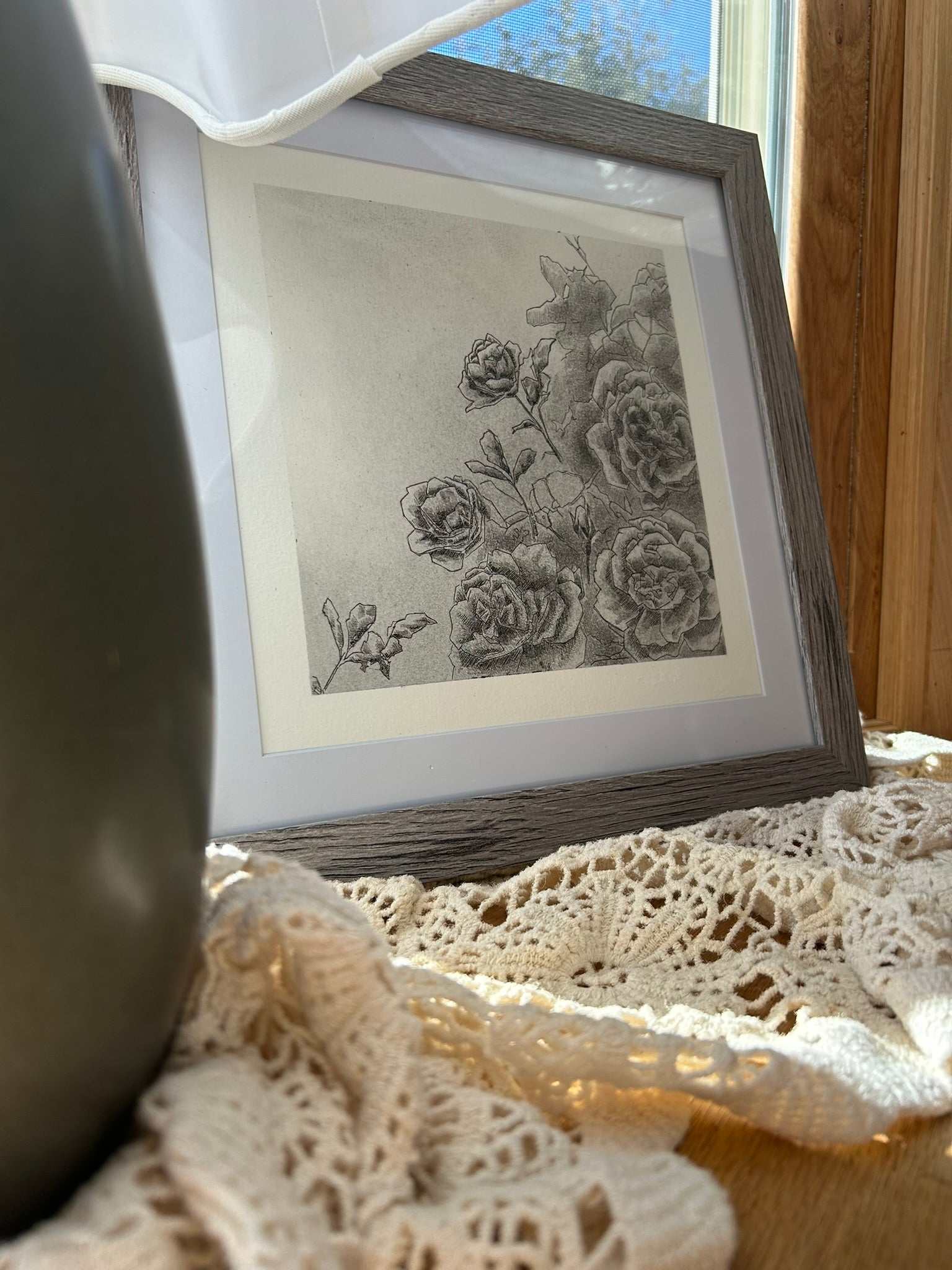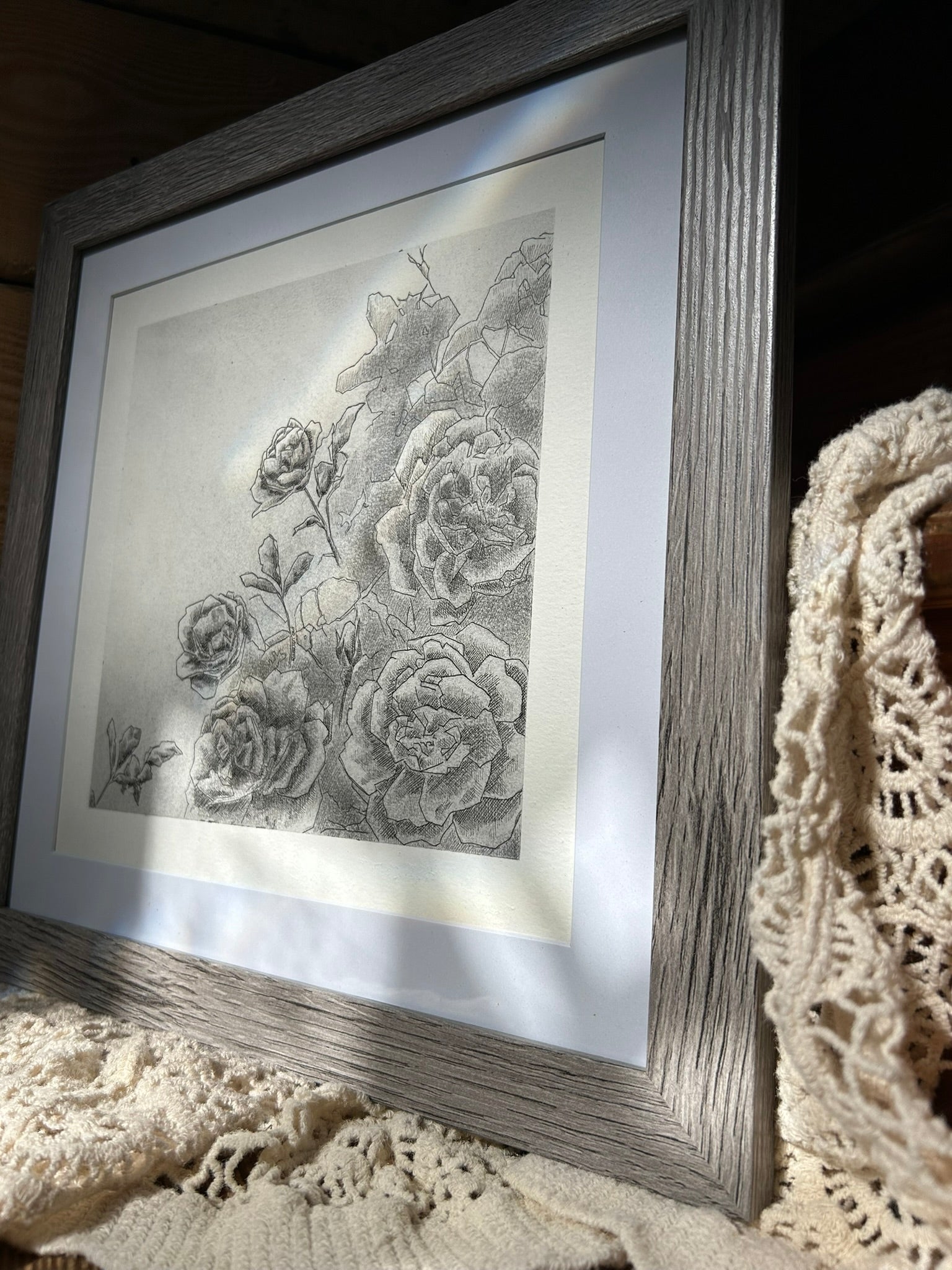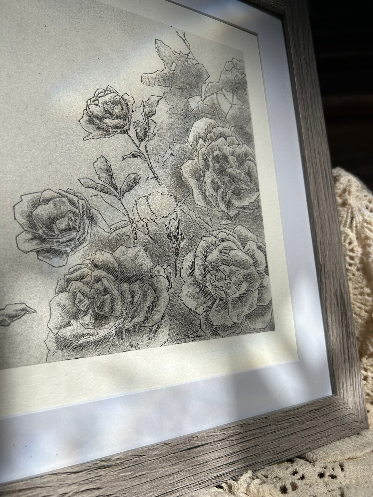 8x8" charcoal and pen original pen drawing matted and framed to 12x12"