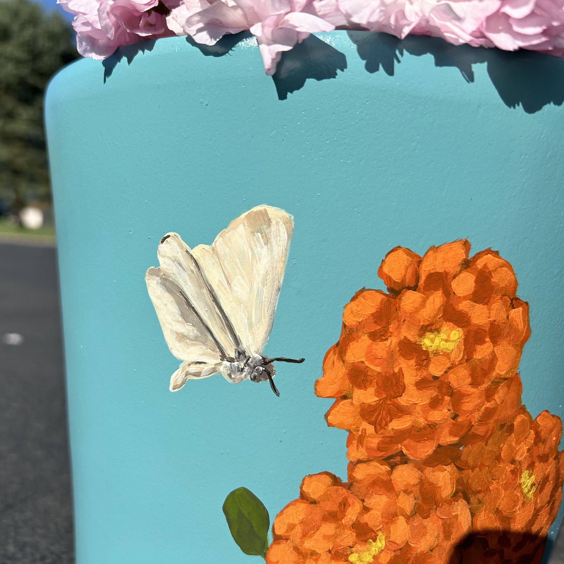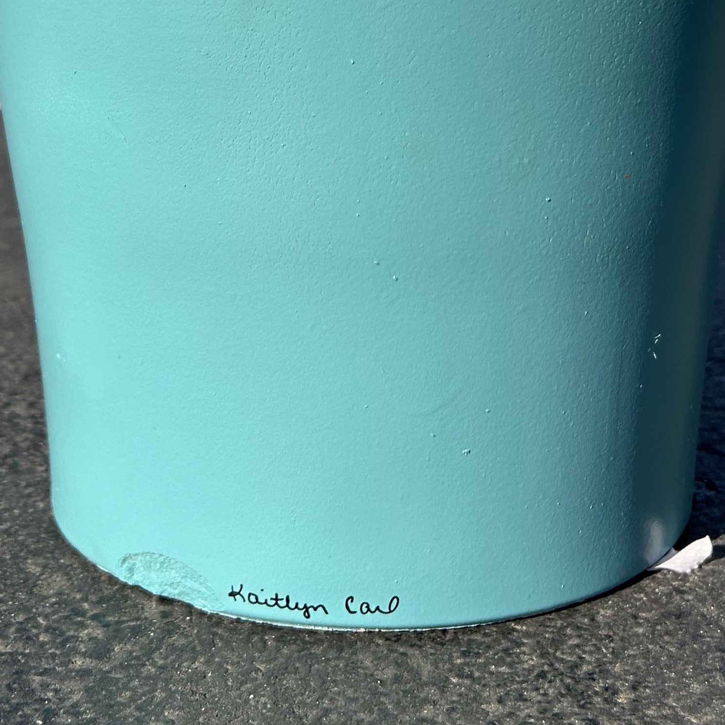 This teal pot is 10.25 inches in diameter, terra-cota, and has a drainage hole to prevent over watering. It can be used inside or outside. If you’ll be using the pot outside, please see our Outdoor Decor Care Guide to make sure that your pots will last beautifully for growing seasons to come.