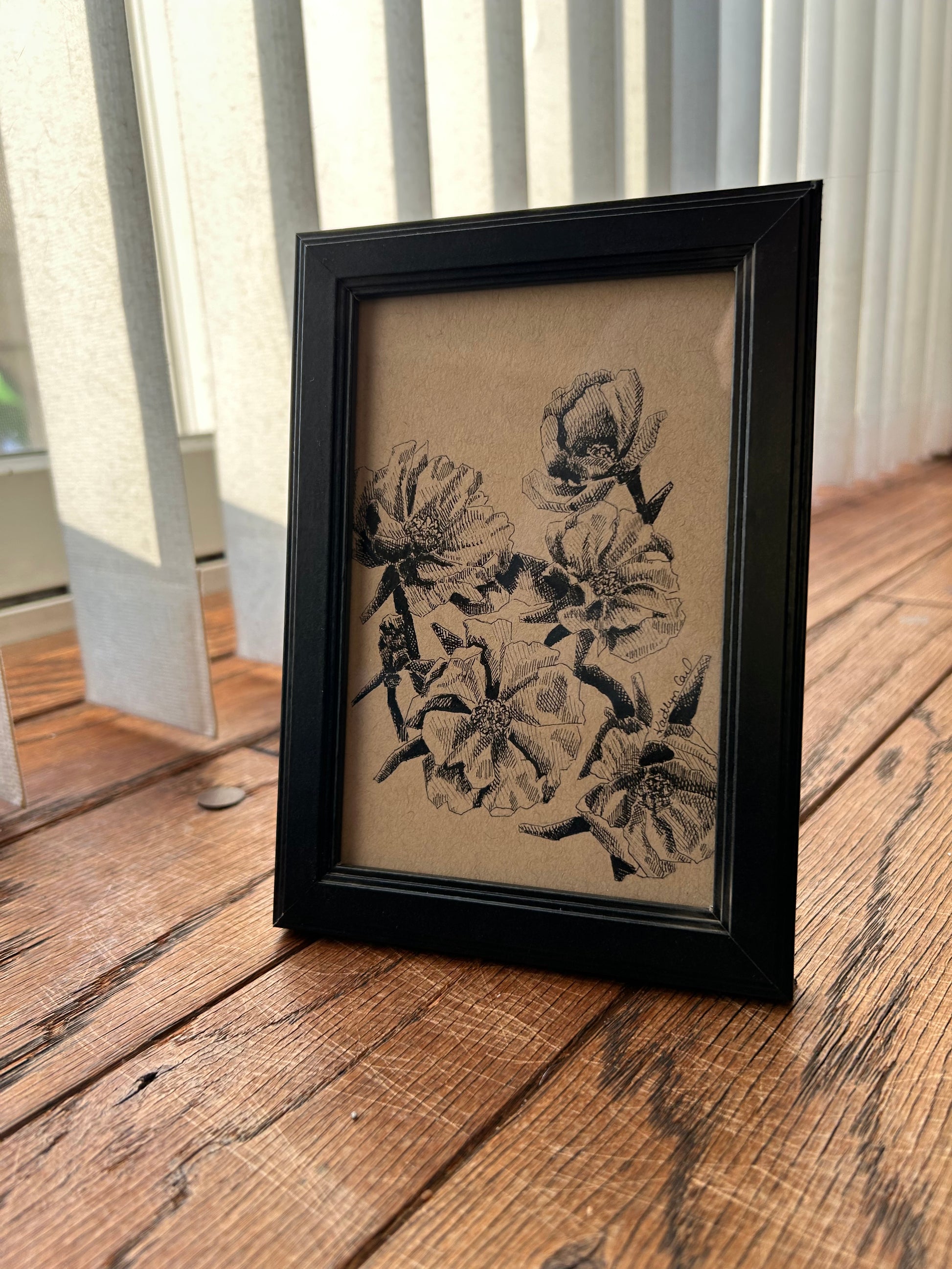 A 4x6" original drawing on tan, 80lb. paper. Drawing ships ready to display in a cute little frame.
