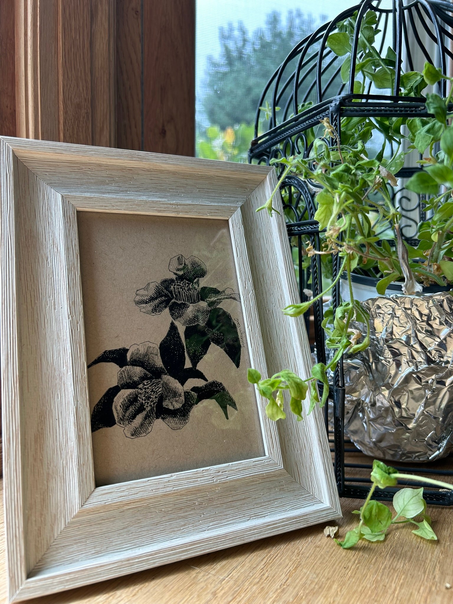 A 4x6" original drawing on tan, 80lb. paper. Drawing ships ready to display in a cute little frame.