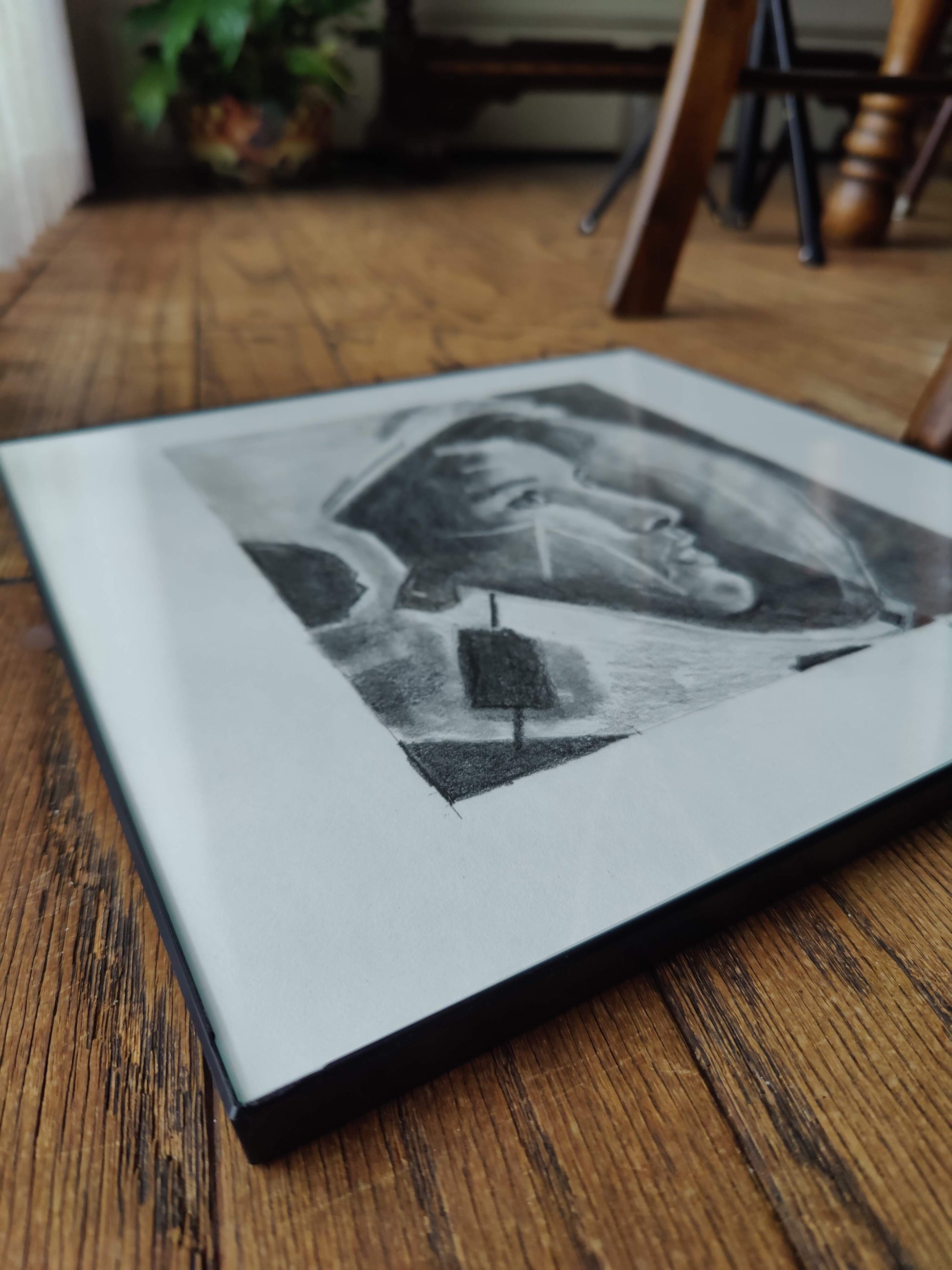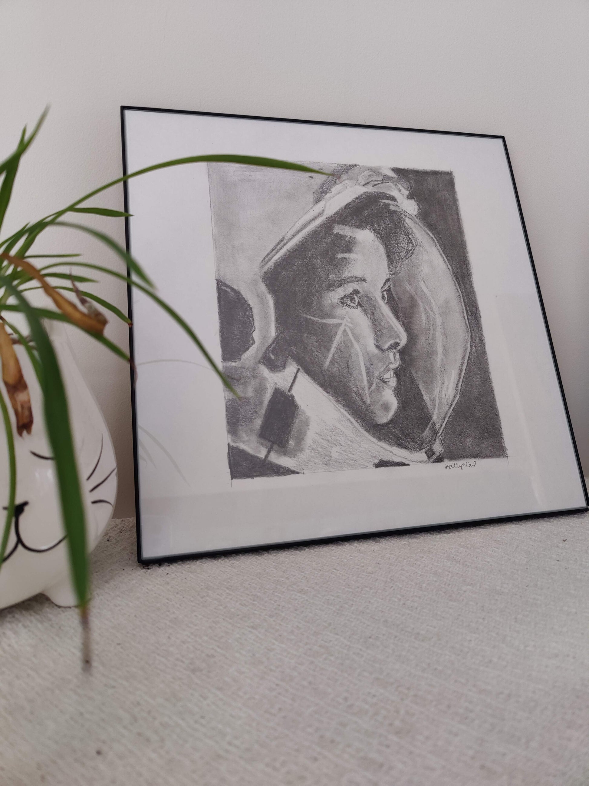 The "Space Girl" graphite drawing is roughly 8x9," on 80lb. drawing paper, and is already in a 12x12 frame - ready to hang!